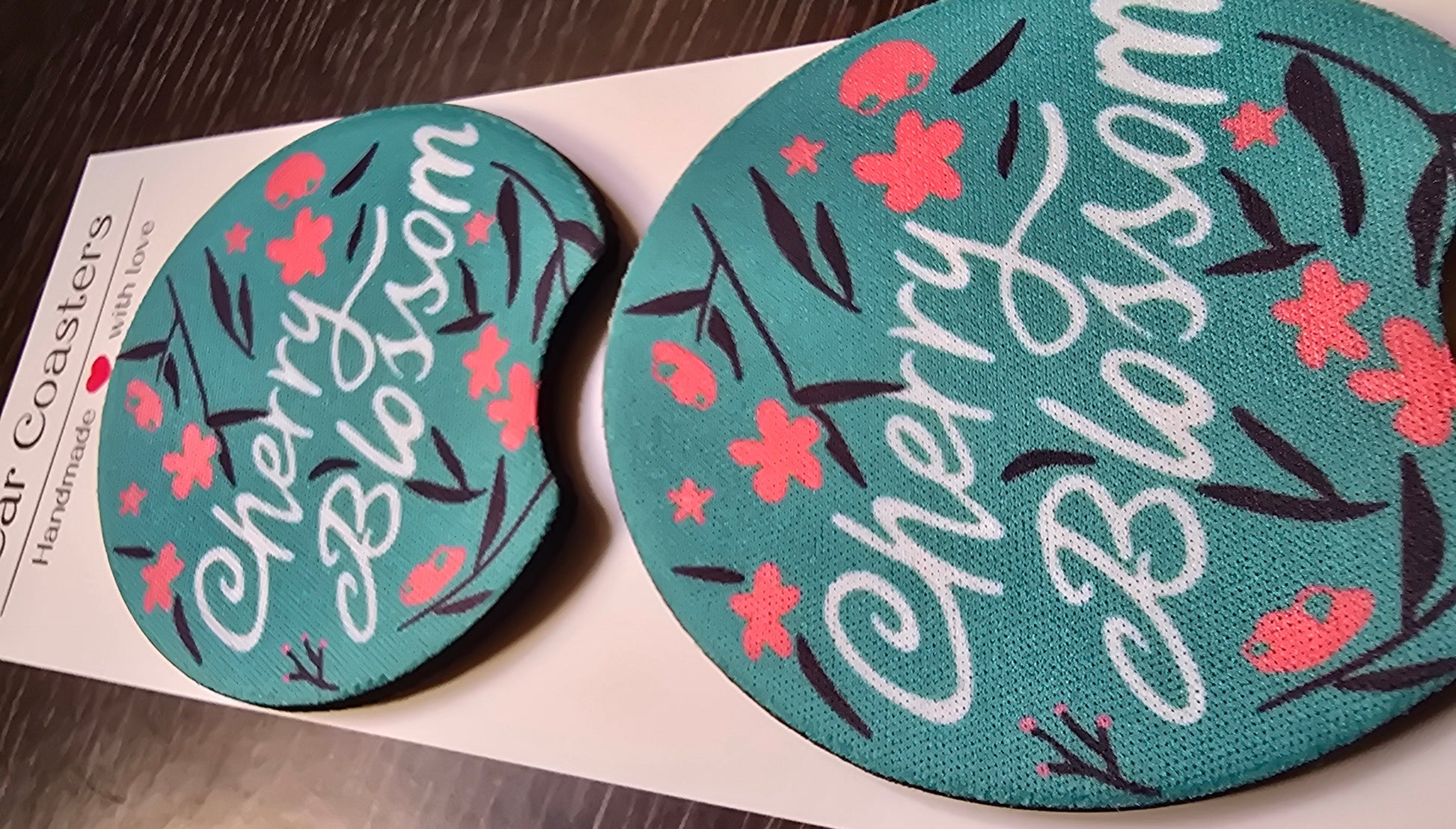 Cherry Blossom car coasters set of 2 adds a touch of personality to your ride.